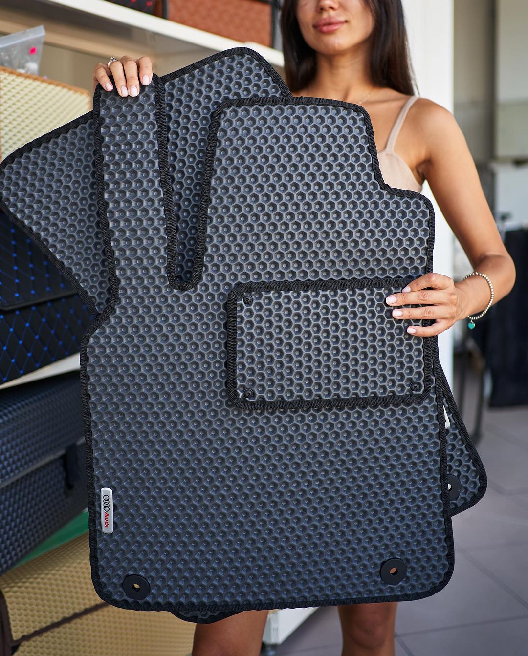 Pentru fabricarea covorașelor folosim un material inovator cu o structură poroasă în formă de "romb" (EVA sau Sevelen). Avantaje: ușor și în același timp rezistent, funcțional și cu un aspect estetic plăcut. De asemenea, are capacitatea de a reține o cantitate mare de lichide, lipsa mirosului, rezistența la substanțe chimice, siguranța absolută pentru sănătate și mediu, menținând toate caracteristicile la temperaturi cuprinse între +50°C și -50°C.